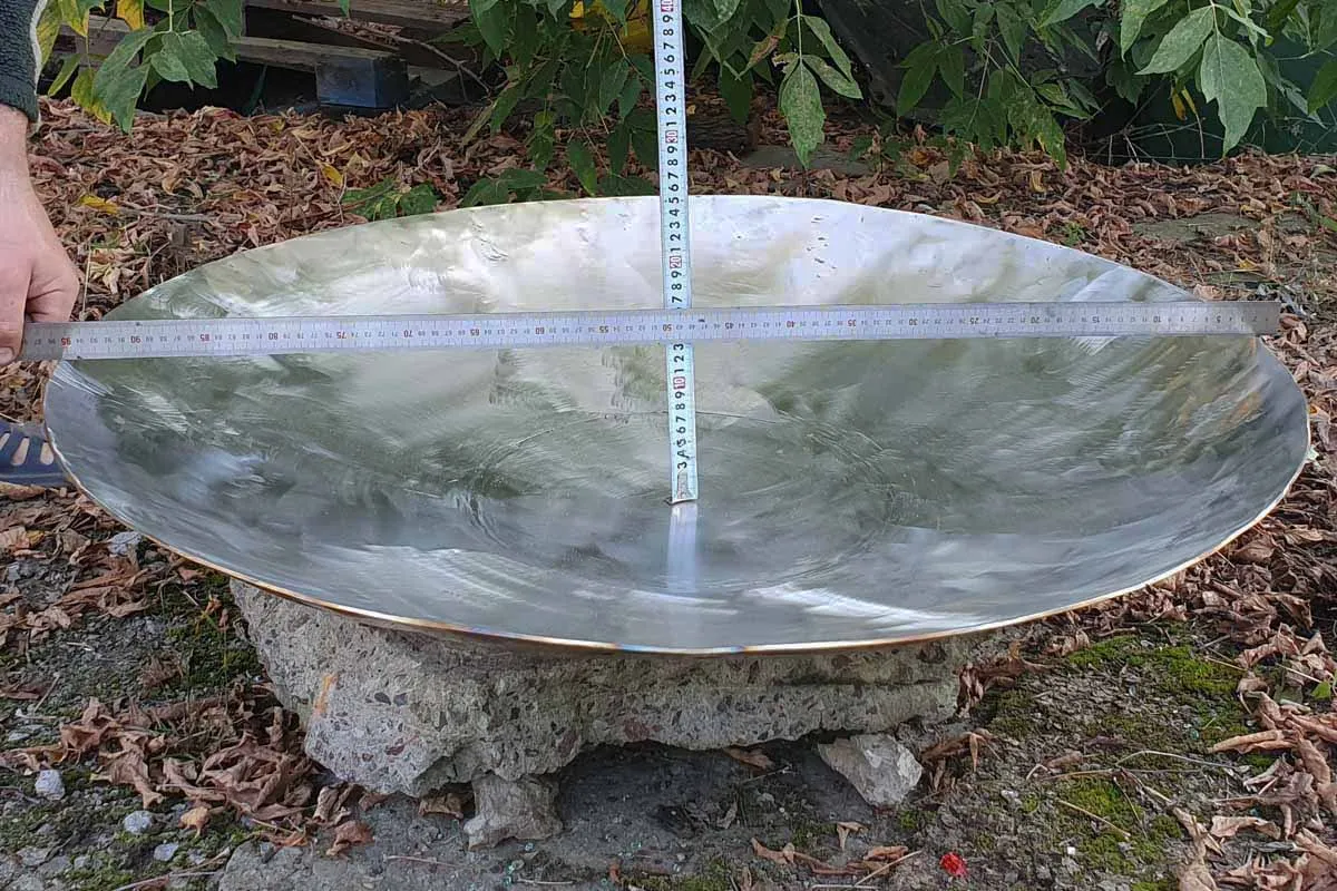 Диаметр костровой чаши 96 сантиметра, глубина чаши 10 сантиметров, толщина метала 3 миллиметра. Материал изготовления - нержавеющая сталь марки AISI 304